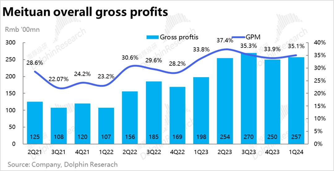 费用和利润层面,本季度美团毛利润为257亿元,毛利率为35.1%,和我们对标去年3Q时35.3%的毛利率水平也是基本一致。