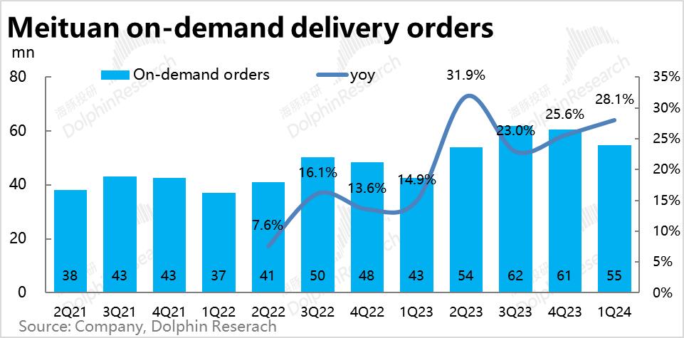 先看主要反映到家业务(餐饮外卖和闪购)表现的配送业务数据,一季度即配总单量约54.6亿单,同比增速达到28.1%。结合公司的指引和第三方调研,市场在业绩前对外卖单量的增速预期在18%~20%左右,对闪购单量增速的预期更高在30%~40%左右,两者合计增速在22%~24%之间,可见单量增长是“实打实”的明显高过了预期。