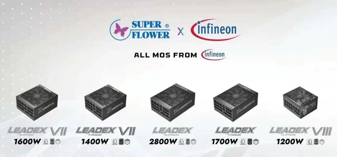 振华电源的LEADEX系列一直以来都是市场上备受推崇的高品质电源产品。此次参展的LEADEX系列电源包括LEADEX VII 1600W、LEADEX VII 1400W、LEADEX 2800W、LEADEX 1700W以及LEADEX VII 1200W等多款型号,它们也采用英飞凌的方案。