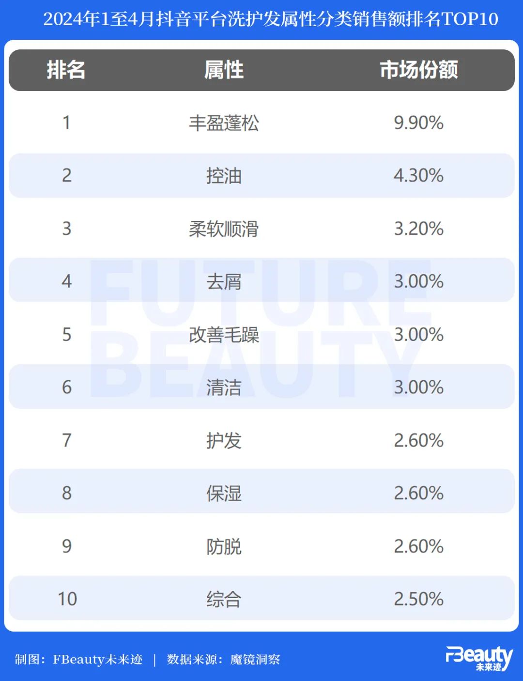 从功能卖点上看,丰盈蓬松、控油、柔软顺滑三大功效宣称,已经替代去屑、防脱、清洁,成为占比最大的功效细分赛道。魔镜情报显示,抖音平台上按洗护发产品属性分类的销售额和市场份额排名前五的分别是丰盈蓬松、控油、柔软顺滑、去屑、改善毛躁等功效,成为消费者最迫切的发用洗护需求。