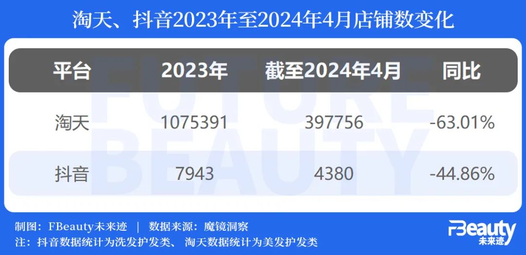 抖音平台显示,2024年1至4月份,洗护发品类店铺数量从2023年全年的2.78万家降至1.35万家,降幅63.01%;品牌数量从2023年的7943个下滑到2024年的4380个;商品数在2023年有15.94万件,截止2024年4月份降至6.53万件,同比下降44.86%。