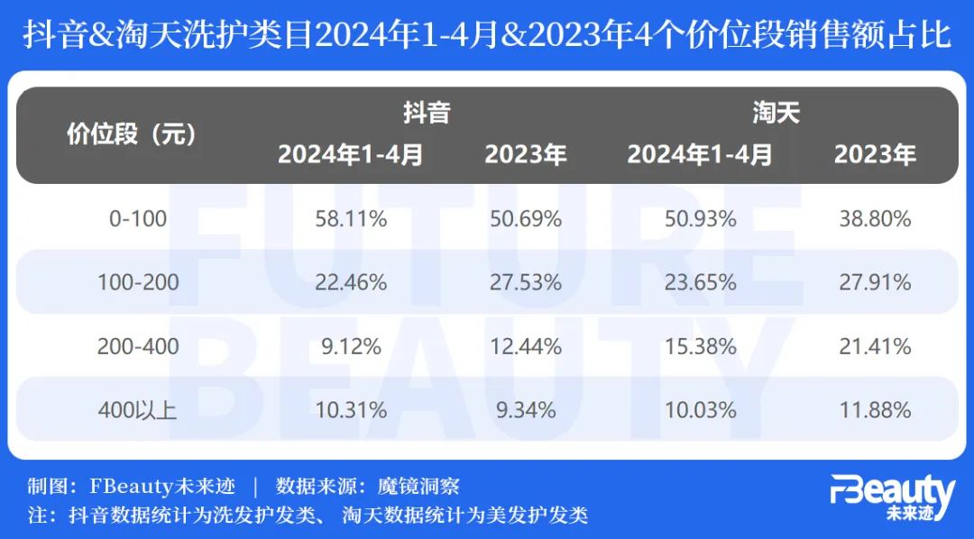 一个最明显的趋势是,市场份额正在向百元以下的价格区间倾斜。魔镜情报显示,抖音和淘天两个平台的洗护类目,均呈现出百元内价格段产品销售扩容的趋势: