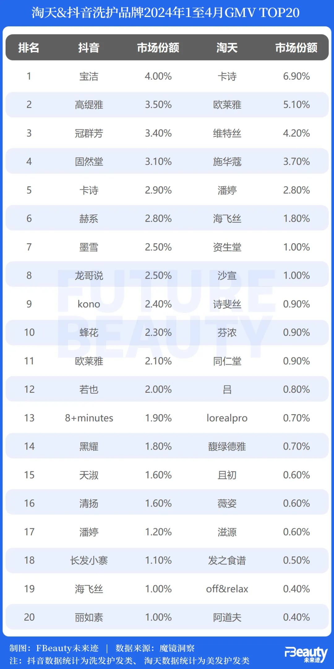 抖音平台的崛起不仅分流淘天,也带动整体美妆市场的增长,其中洗发护发赛道在2024年1-4月份增长28.4%,在所有品类中靠前。而在抖音的带动下,一大批洗护白牌增长迅猛,快速占领了Top20份额,尤其高缇雅、冠群芳、固然汤、赫系、龙哥说等品牌堪称“拔地而起”。