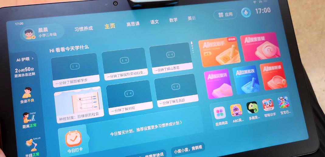 当前高端学习机产品几乎都落地了诸如精准学、作文批改、互动阅读、体态提醒、背诵听写检查、指尖翻译、语音助手等各种AI功能。功能覆盖的广泛程度,从培养学生用眼习惯到素质教育“拓展拔高”,一应俱全。