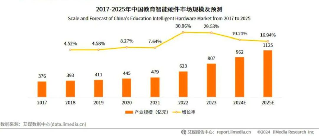 据艾媒咨询数据显示,2017~2023年中国教育智能硬件市场规模整体呈现上升趋势。其中,在“双减”政策发布后的第二年(2022年),中国教育智能硬件市场规模的增长率开始大幅度飙升,并在2023年录得总市场规模807亿元,同比增长29.53%的成绩。艾媒咨询还预测称,预计2025年中国教育智能硬件市场规模将超1000亿元。