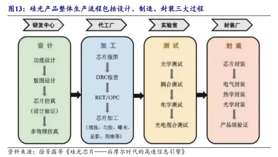 硅光产品整体生产流程包括设计、制造、封装三大过程。