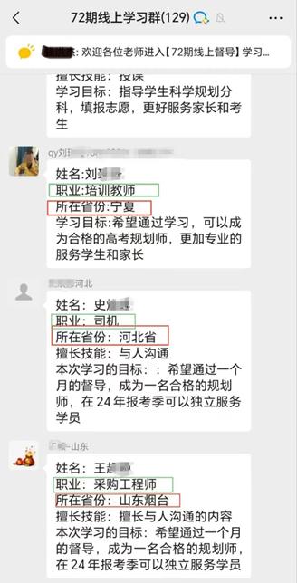该负责人在朋友圈发布的宣传内容显示,高报师入行门槛低,没有专业要求,30-60岁均可报名,培训后便能持证上岗。 刚毕业的小白,服务一个学生能赚600-800元;有经验后,在总部对接线上学员,服务一个学生能赚800-1200元。