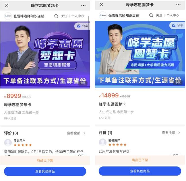 这里说的高考志愿填报服务,指的是在“峰学蔚来”“张雪峰老师”微信公众号等渠道销售的15999元的峰学志愿圆梦卡、8999元的峰学志愿梦想卡等产品。目前,这些产品均已下架。在峰学蔚来APP首页中部,“高报服务PRO”一栏显示,“本轮名额已售罄,敬请期待下一轮名额”。