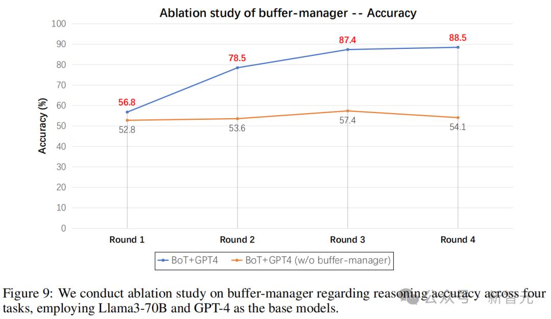 随着轮次的增加,带有缓冲区管理器的模型不断扩展元缓冲区,同时利用从先前解决的问题中获得的思维模板来帮助解决后续类似的问题。