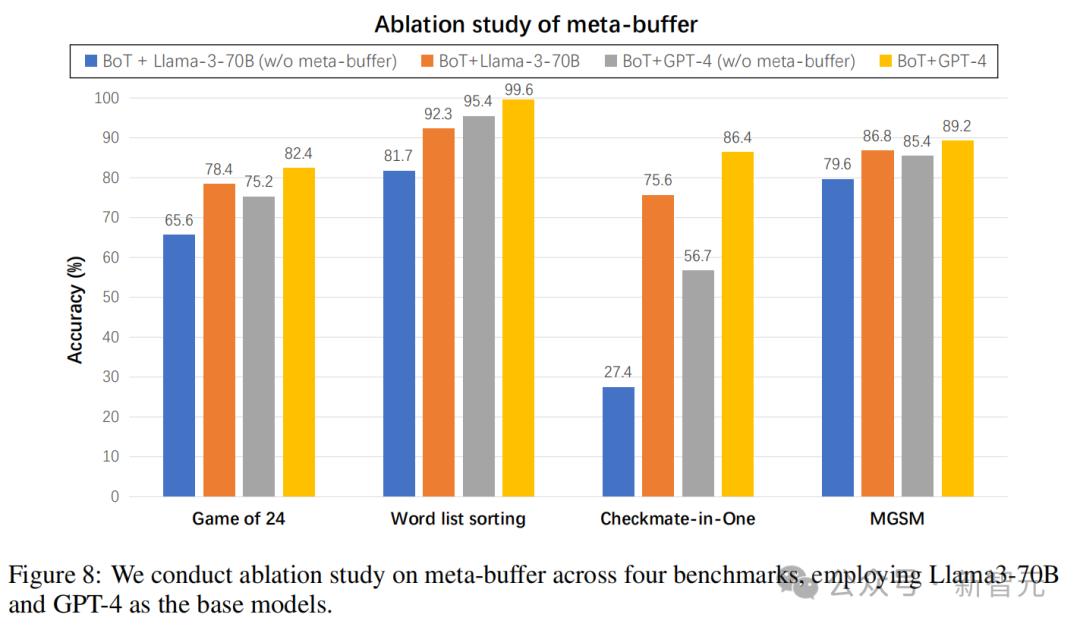 当元缓冲区被禁用时,Llama3-70B和GPT-4模型的性能显著下降,特别是在需要复杂推理的基准测试中,如24点游戏和一步将死。