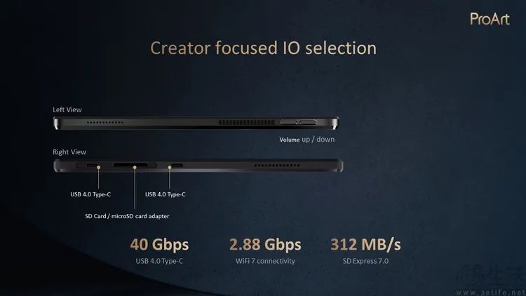 但如果去仔细观察这款ProArt平板电脑的配置就会发现,它有那么一个相当微妙的槽点,那就是配备了一个SD Express 7.0规格、理论峰值速度为312MB/s的SD读卡器。