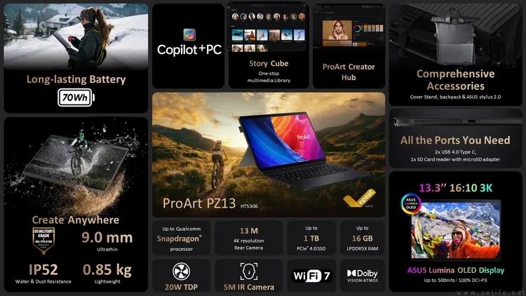 其中,华硕ProArt PZ13显然是一个比较独特的例子。一方面,它采用的是高通最新的骁龙X系列PC处理器,算得上是Windows on ARM生态的最新产品。但从另一方面来说,这款13英寸的“类Surface”设备却是一款着重于图像编辑和绘制任务的生产力设备,而非以往大多数“骁龙本”那样的超轻薄商务向笔记本电脑。