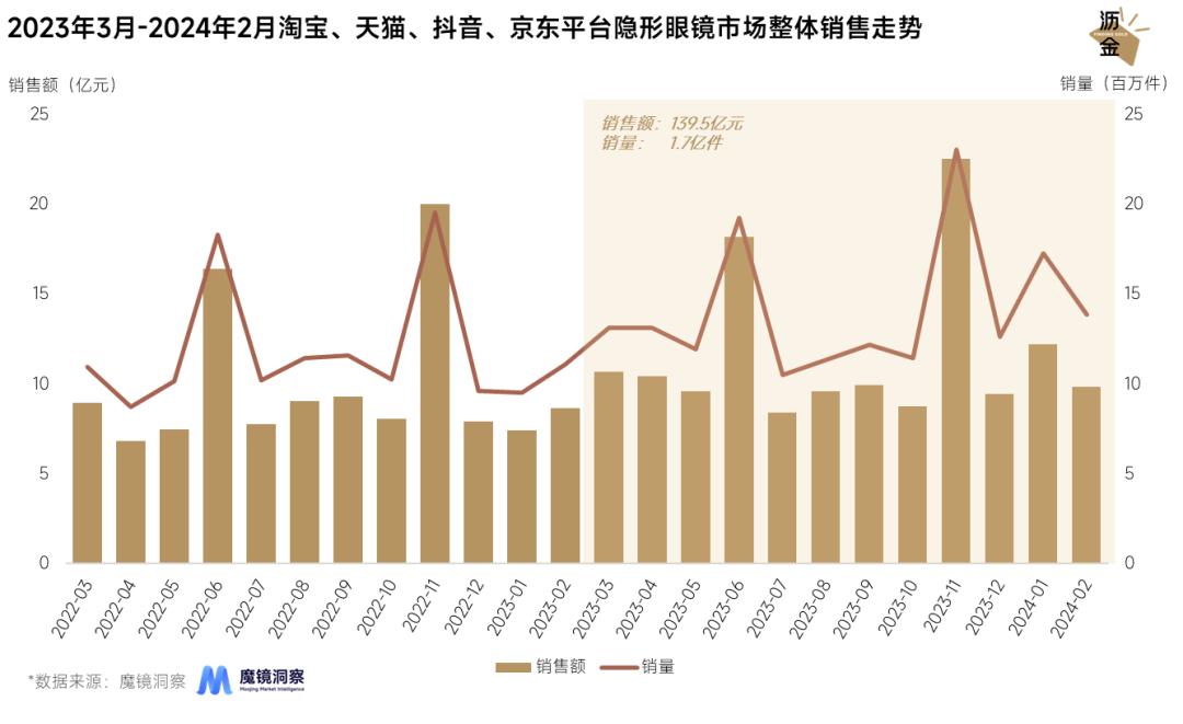 2023年3月-2024年2月,隐形眼镜线上销售额达到139.5亿元,同比增长18.5%,市场均价基本持平,稳定在82元左右。