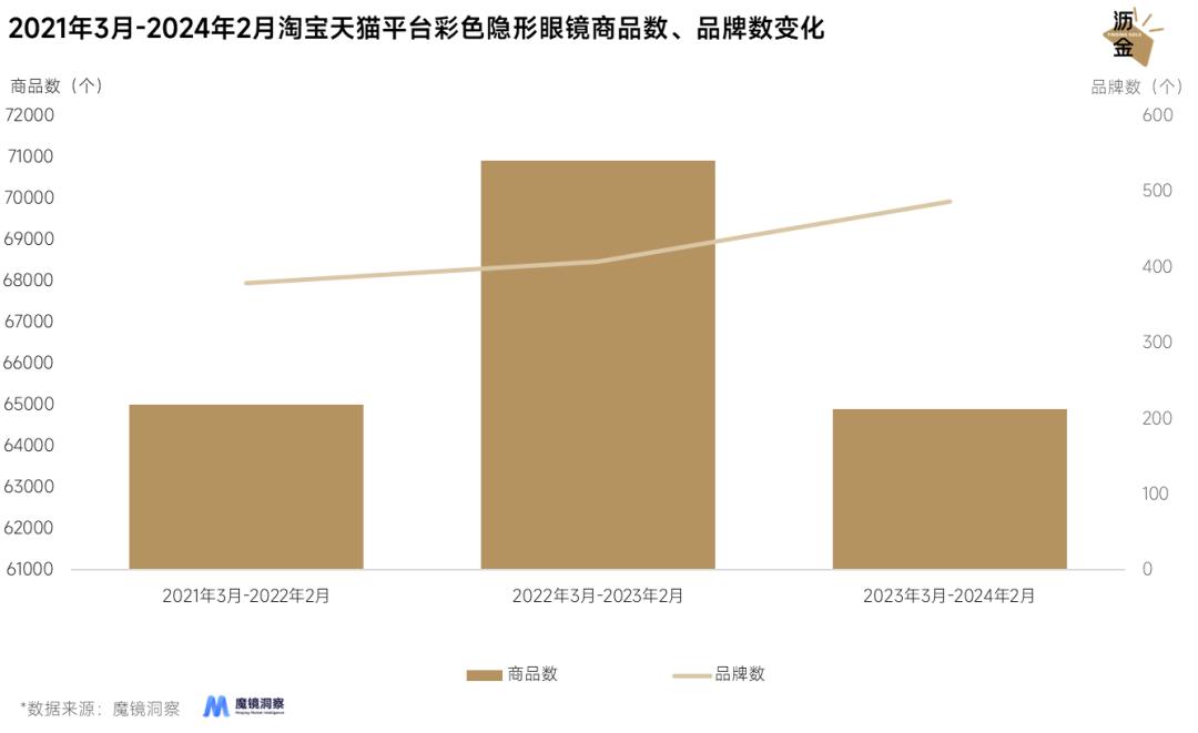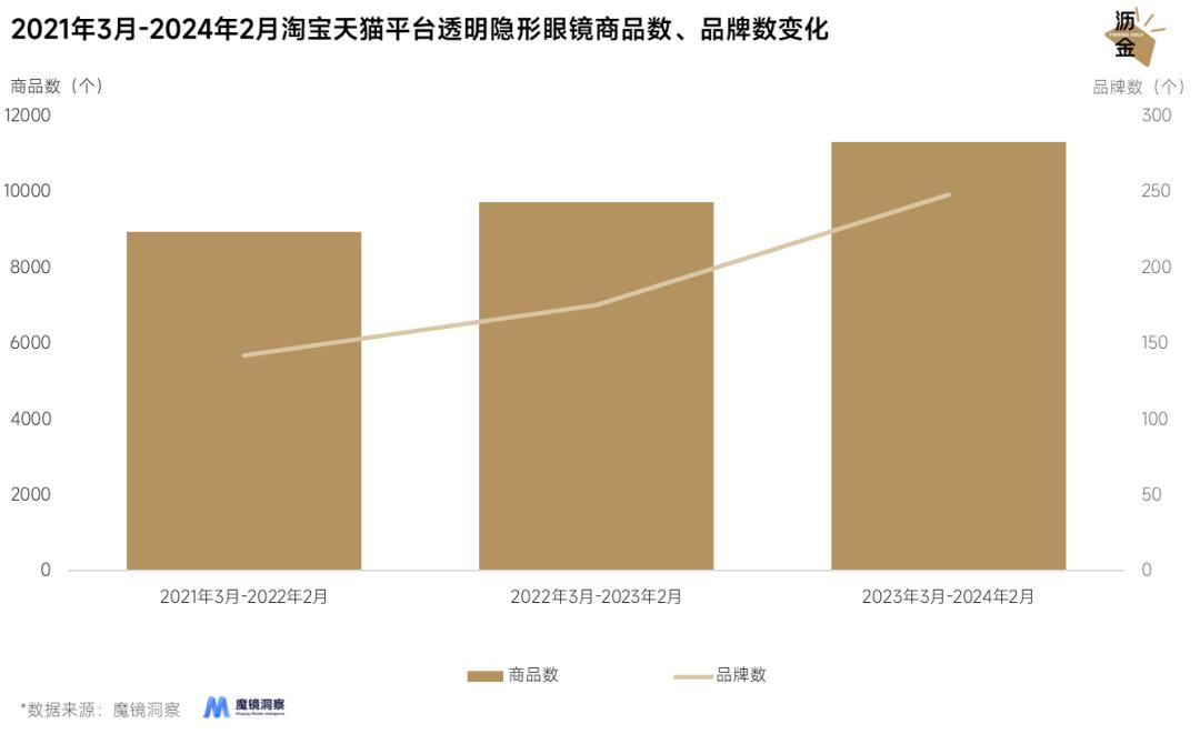 21年3月-24年2月淘宝天猫平台透明隐形眼镜商品数、品牌数变化
