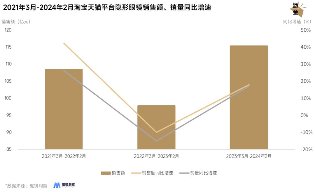 21年3月-24年2月淘宝天猫平台隐形眼镜销售额、销量同比增速