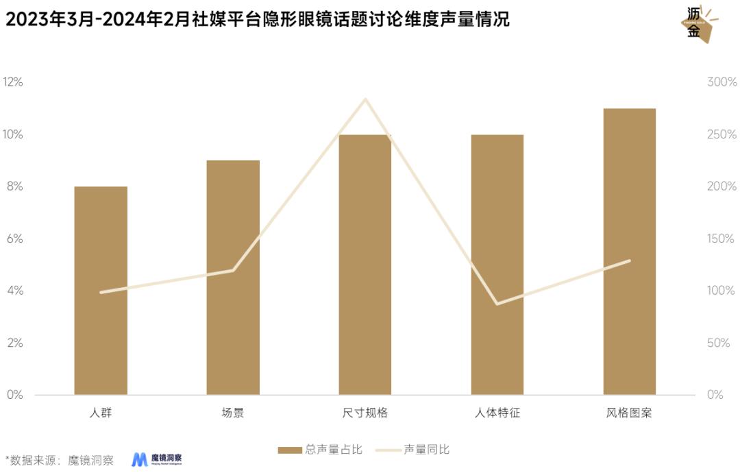 2023年3月-2024年2月,抖音、微博、小红书平台隐形眼镜话题声量达到80w+,人群、尺寸大小、场景是大众讨论的主要维度。场景、尺寸规格维度声量表现出较高的增速,分别为119.6%、284.2%。