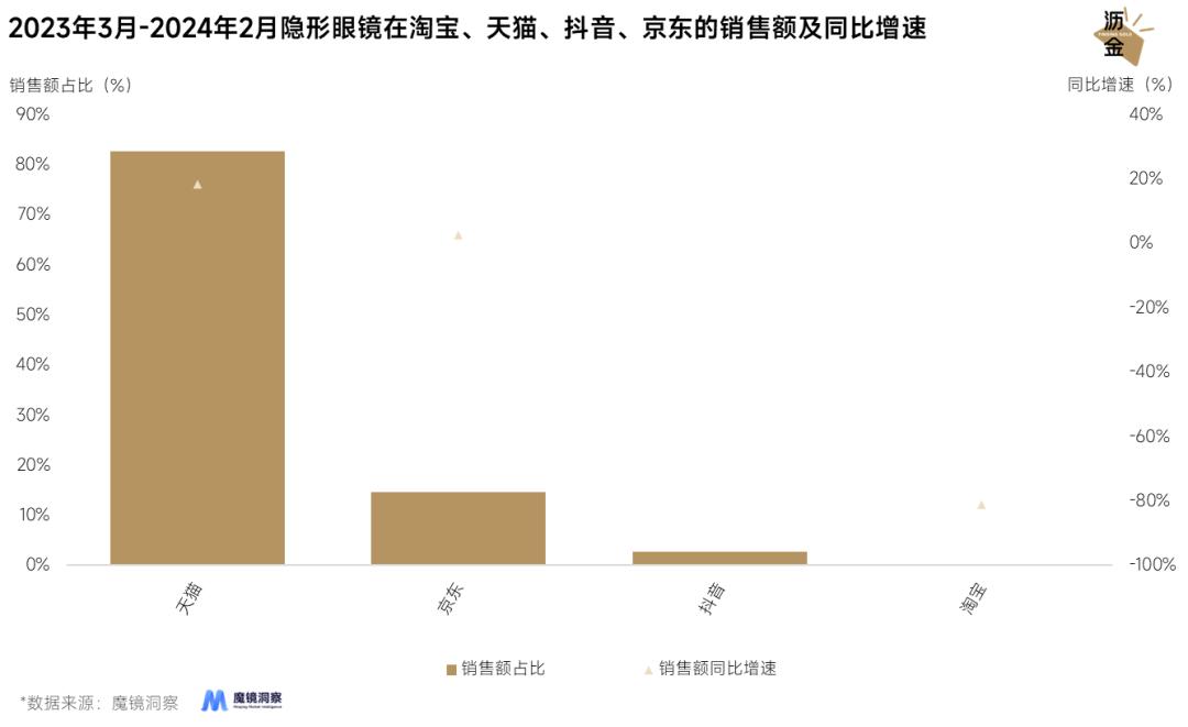 23年3月-24年2月隐形眼镜在淘宝、天猫、抖音、京东的销售额及同比增速
