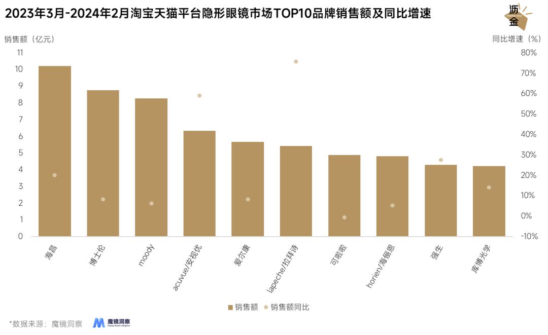 隐形眼镜市场下,主打透明隐形眼镜的传统品牌位居头部,主打彩色隐形眼镜品类的拉拜诗增速迅猛,销售额同比增长高达75.8%。
