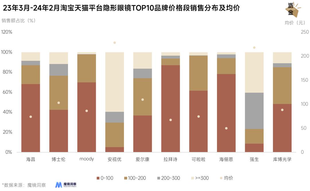23年3月-24年2月淘宝天猫平台隐形眼镜TOP10品牌价格段销售分布及均价