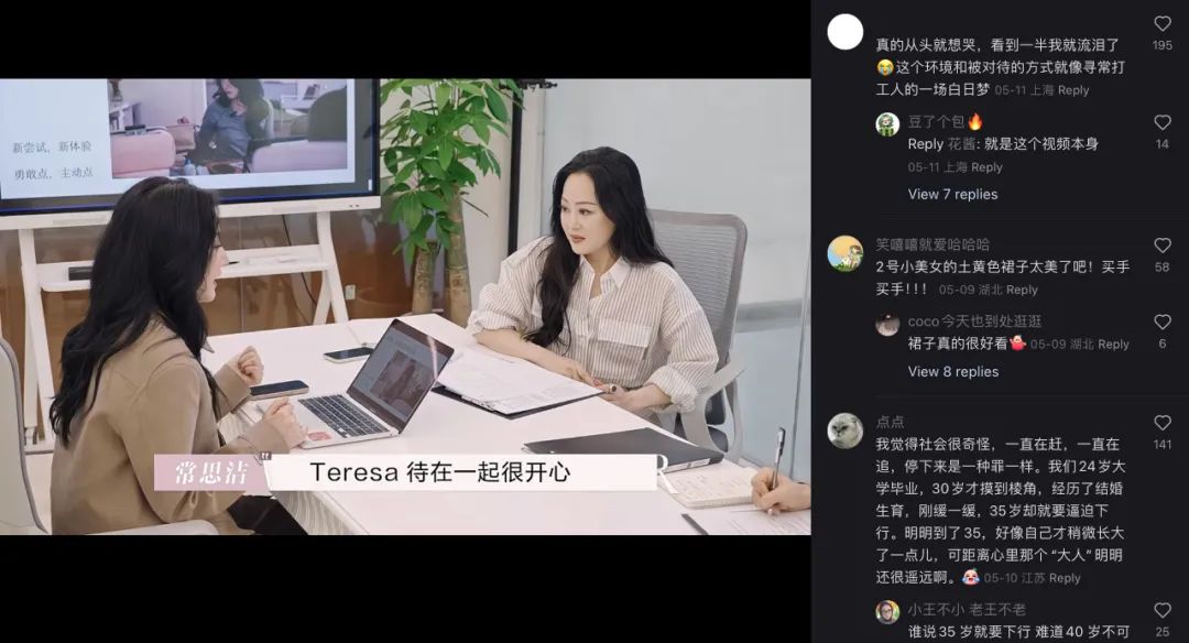 而第一次听到这些女孩掏心窝的讲述,章小蕙直言“我很骄傲”,且她全程都表现出不同于爹味领导、与员工平起平坐的沟通姿态,用自身经历安抚或鼓励不自信的年轻女孩“你总会找到你头上的一片天”。如此“理想主义”的梦幻老板也令小红书用户破防了,评论区随处可见“真的从头就想哭”、“好羡慕章小姐的员工”、“这个环境和被对待方式就像打工人的一场白日梦”等走心评价。