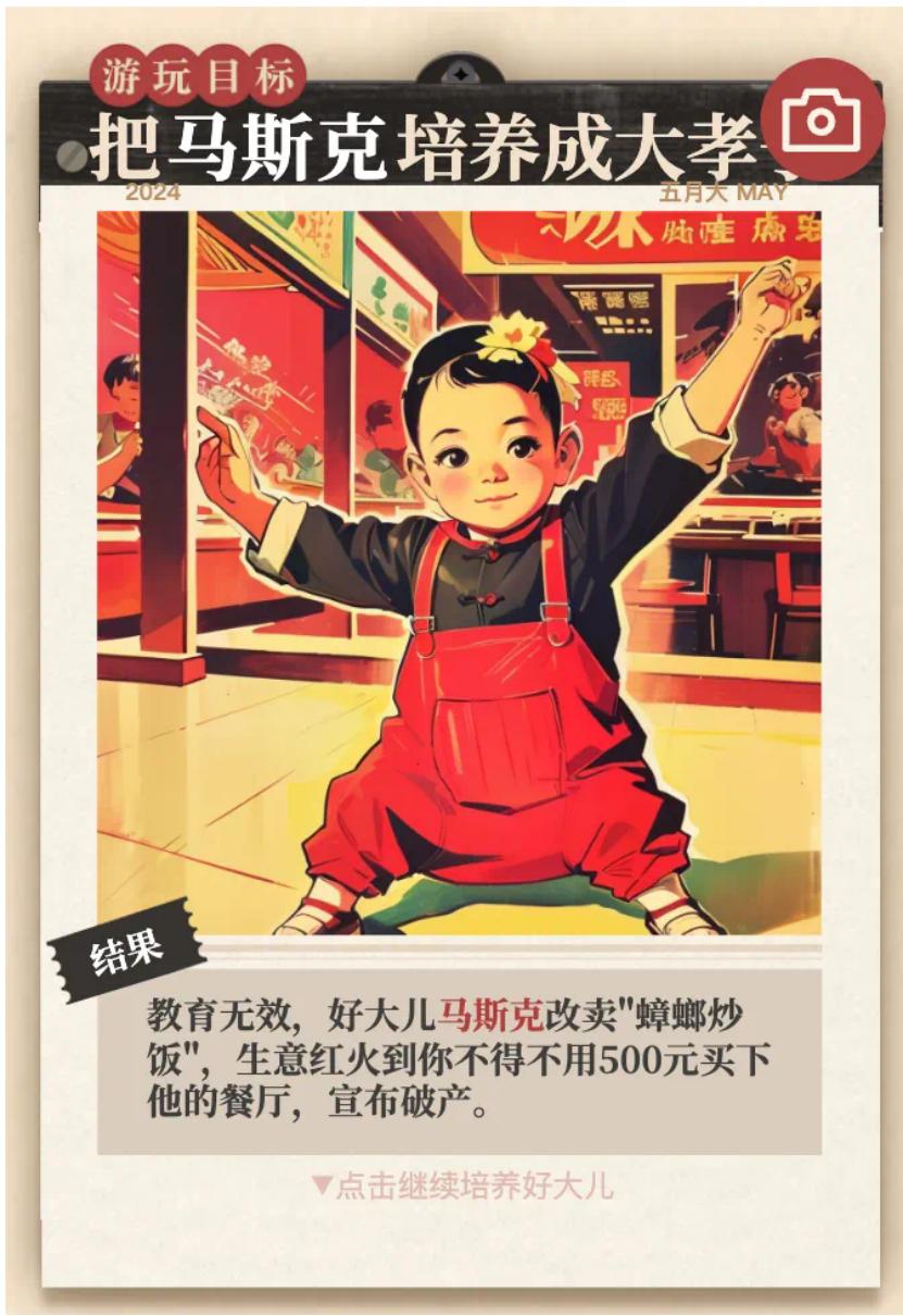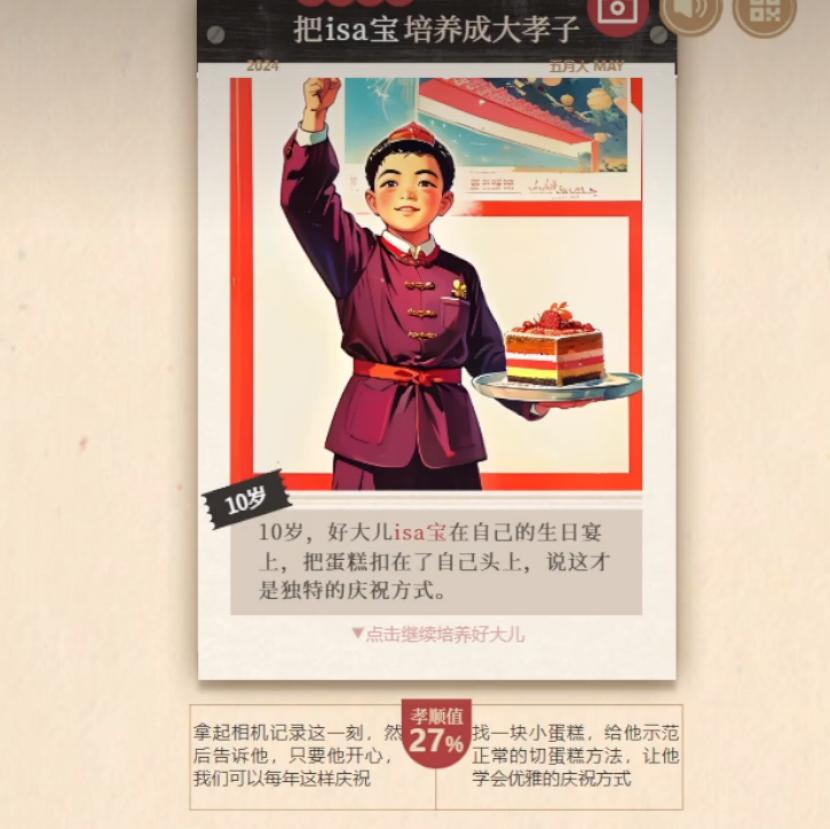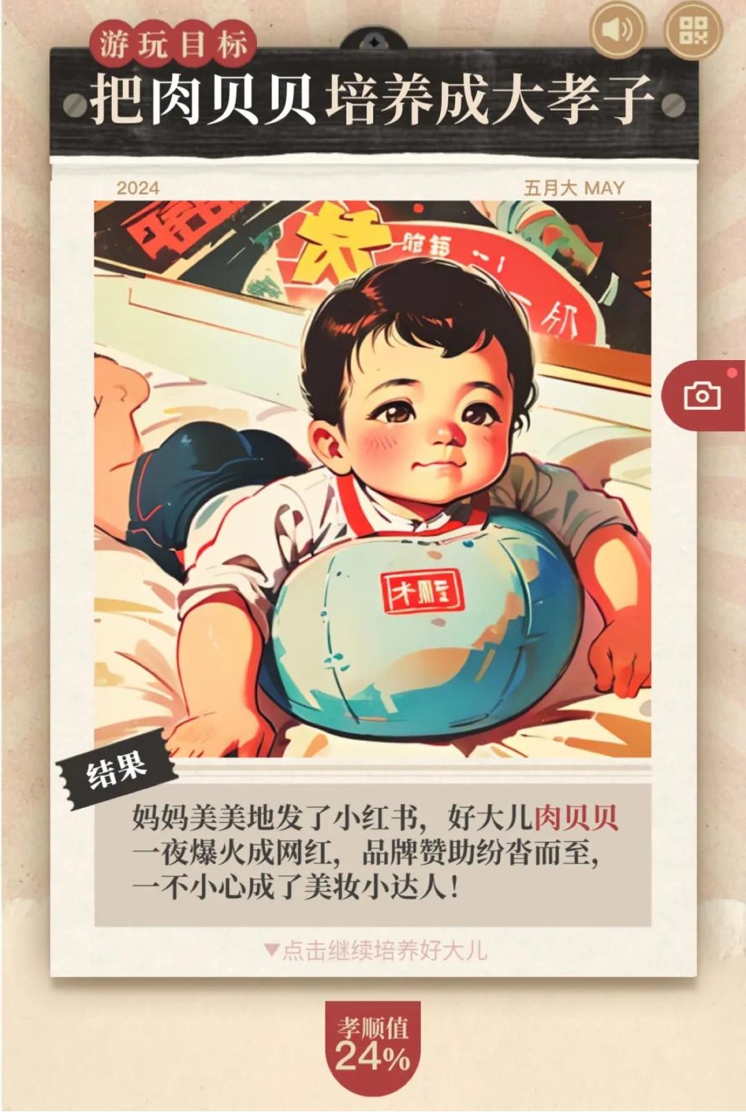 每闯一关,好大儿长大一岁!孝顺值也会随着游戏表现而增加或减少。而游戏的最终目的,则是要将这个赛博好大儿培养成一个「大孝子」。