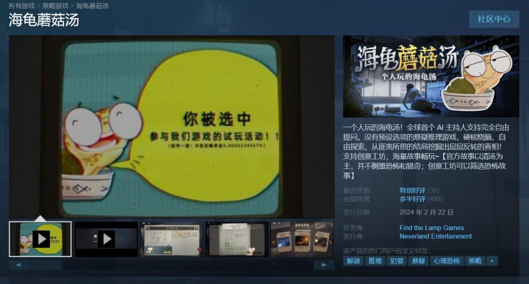 今年2月,由盏灯工作室开发的文字解密推理游戏《海龟蘑菇汤》上线Steam平台,而与传统“海龟汤”的玩法相比,其最大的创新,就是将游戏中进行问答的主持人,换成了生成式AI。