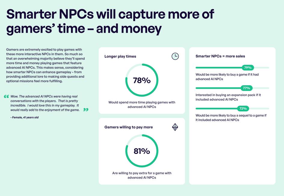 去年,生成式 AI 数字人 / 虚拟角色开发公司 Inworld 调查了 1000 名游戏玩家。其中81% 的人会为带有 AI NPC 的游戏支付额外费用。