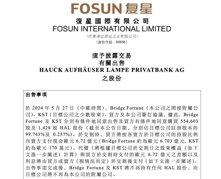 5月28日,复星国际(0656.HK)在港交所发布公告,旗下德国私人银行Hauck Aufhäuser Lampe Privatbank AG (HAL)悉数股权将被出售。