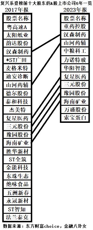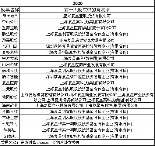 到2020年,大A中占了前十大股东的复星公司就从2017年的25家缩减到了20家。