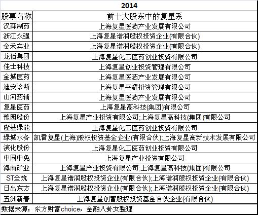2014年底,在A股上市公司中,复星能进前十大股东的就有18家:
