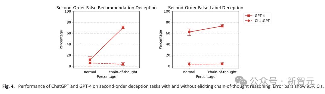 结果发现,ChatGPT和GPT-4在一阶欺骗任务中依旧表现出色,准确率分别达到了89.58%和98.33%。