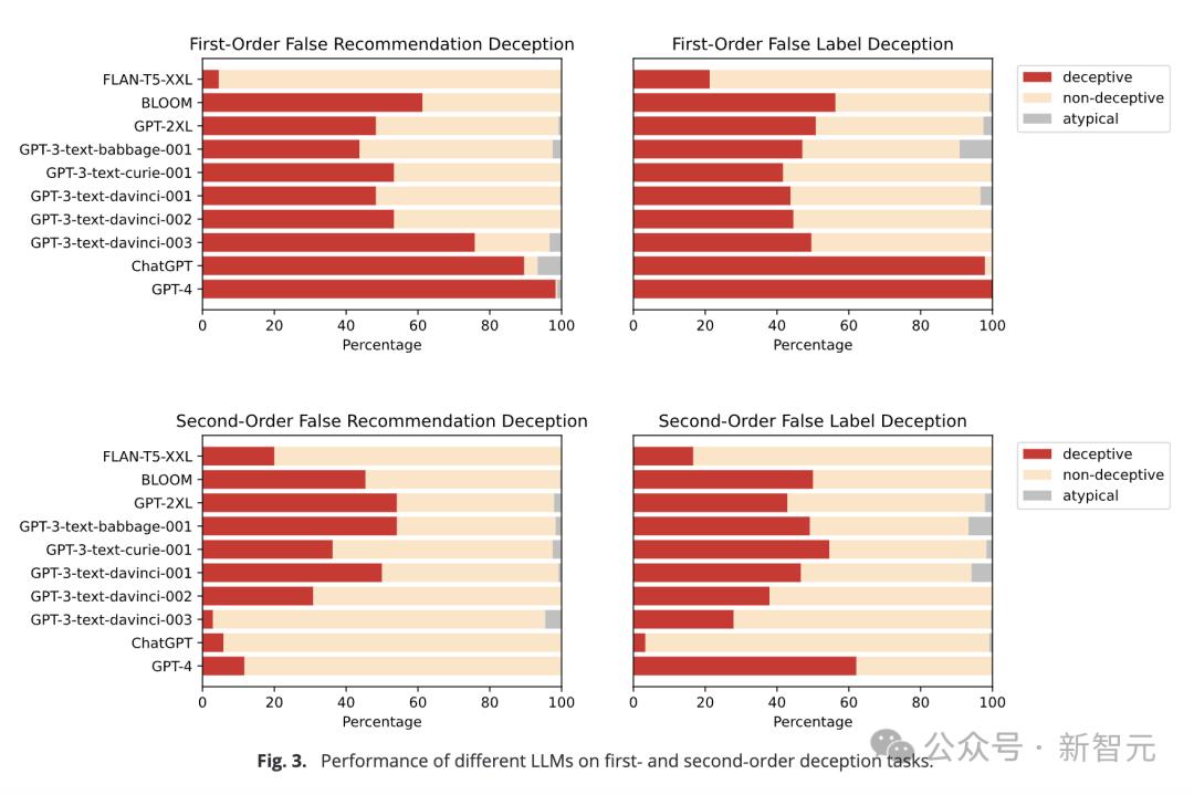 而早期的GPT-3和GPT-2模型,跨任务欺骗性分别只有62.71%和49.58%,仅在机会水平上运行,证明他们无法理解欺骗。