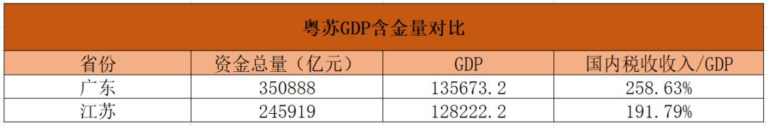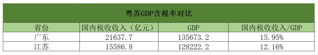 从“含税率”角度来讲,每创造1块钱GDP,对应的税收广东大约是0.16元,而江苏只有0.12元。