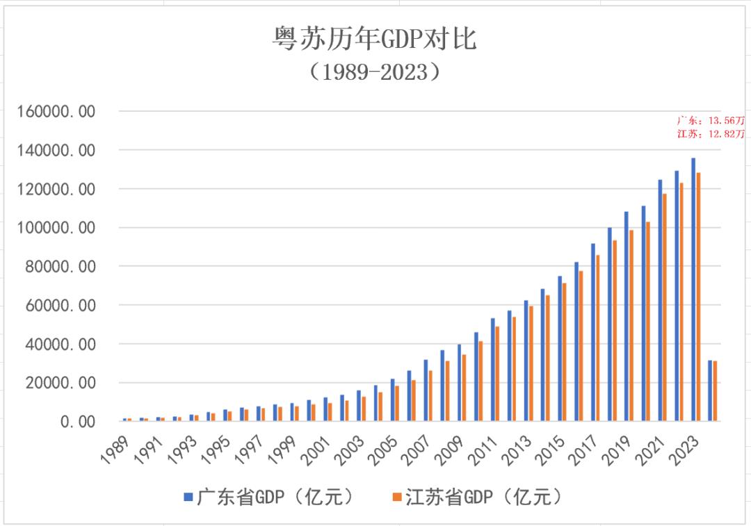 这是广东自1989年问鼎中国经济第一大省以来,粤苏差距最小的时刻。