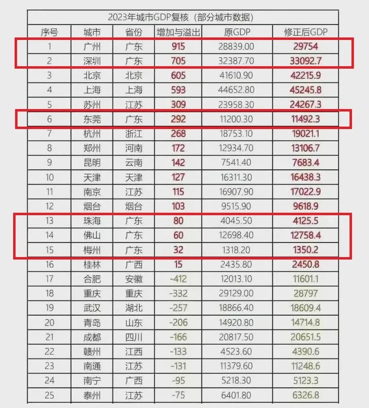 就拿2023年来说吧,国家复核各城市GDP的时候,发现广东的城市,几乎清一色都少报了GDP。就这一年,广州少报了915亿,深圳少报了705亿,再加上东莞、佛山、珠海、梅州,足足少报了2084亿。