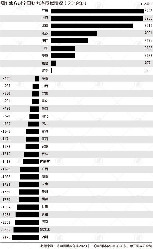 这六省三市中,常年贡献最大的就是广东、上海和北京。2019年,来自广东的财力净贡献,比江苏高出整整一倍还多。