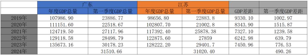 过去几年,粤苏差距从9千多亿,一路下降到7千多亿。第一季度的落差,也从最高峰的1500亿,缩小到500亿以内,缩小了2/3。