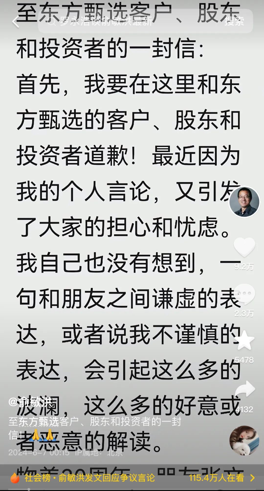 6月7日凌晨,新东方创始人、东方甄选CEO俞敏洪发布公开信,向东方甄选客户、股东和投资者道歉。