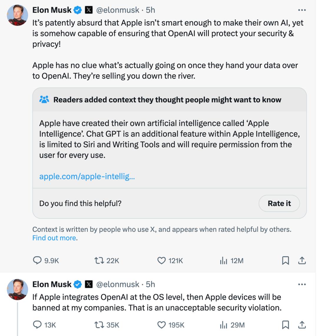马斯克表示:“苹果不聪明,无法制造自己的AI,却认为能够确保OpenAI保护你的安全和隐私,这是荒谬的!一旦将用户的数据交给OpenAI,苹果就不知道到底发生了什么。他们正在出卖你。”