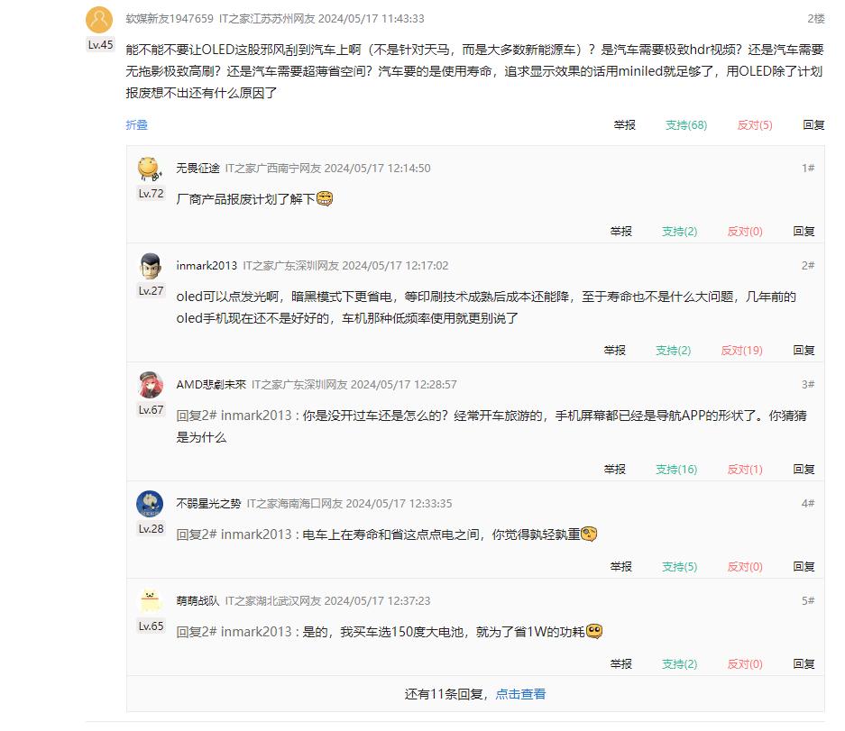 但评论区的网友们,貌似对这款屏幕并不感兴趣,反而是对 “ 该不该在车机上用 OLED ” 这个问题讨论得异常起劲。