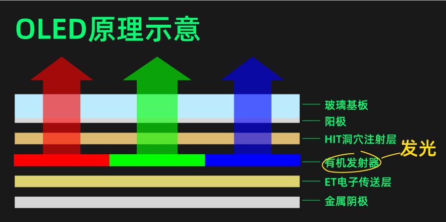 通过给不同颜色的有机材料施加电流就能显示不同颜色的光,同时通过的电流越大,亮度也就越高。
