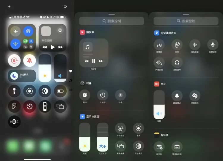 新的控制中心默认分为三个板块,分别是「控制中心」、「音乐」和「连接控制」,音乐播放组件的优先级被大幅提高。当然,如果用户有需要也可以自行增加个性化板块,比如 HomeKit 智能家居板块等。