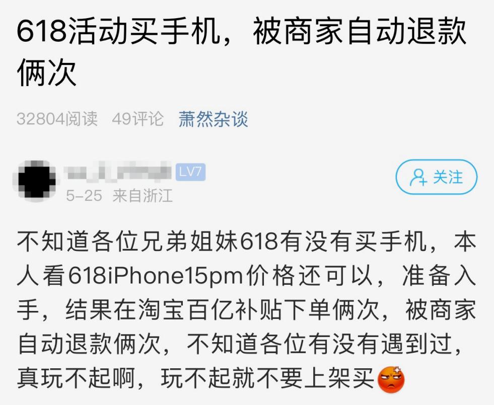 5月25日,杭州萧山一名网友在本地论坛发帖称:“618活动买手机,在某平台买了4次退了4次,不打算买了,玩不起就不要上架卖”。无独有偶,早在5月初时,一些网友发帖,称自己平时都是正常消费,搞不懂是什么原因导致的“砍单”。