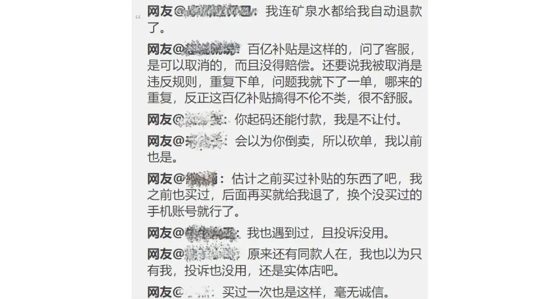 除上述网友所说的状况,微博上有网友吐槽,去年双十一开始,淘宝百亿补贴也出现了自动退单的现象。在帖子的下方评论区,很多网友表示在不同平台上都遇到过同样的状况,而且不限于手机等贵价商品,有网友买矿泉水也被自动退款了。