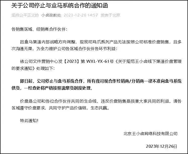去年十二月,王小卤与盒马停止合作同样是因为双方在供货价格上谈不拢,零供矛盾加深。