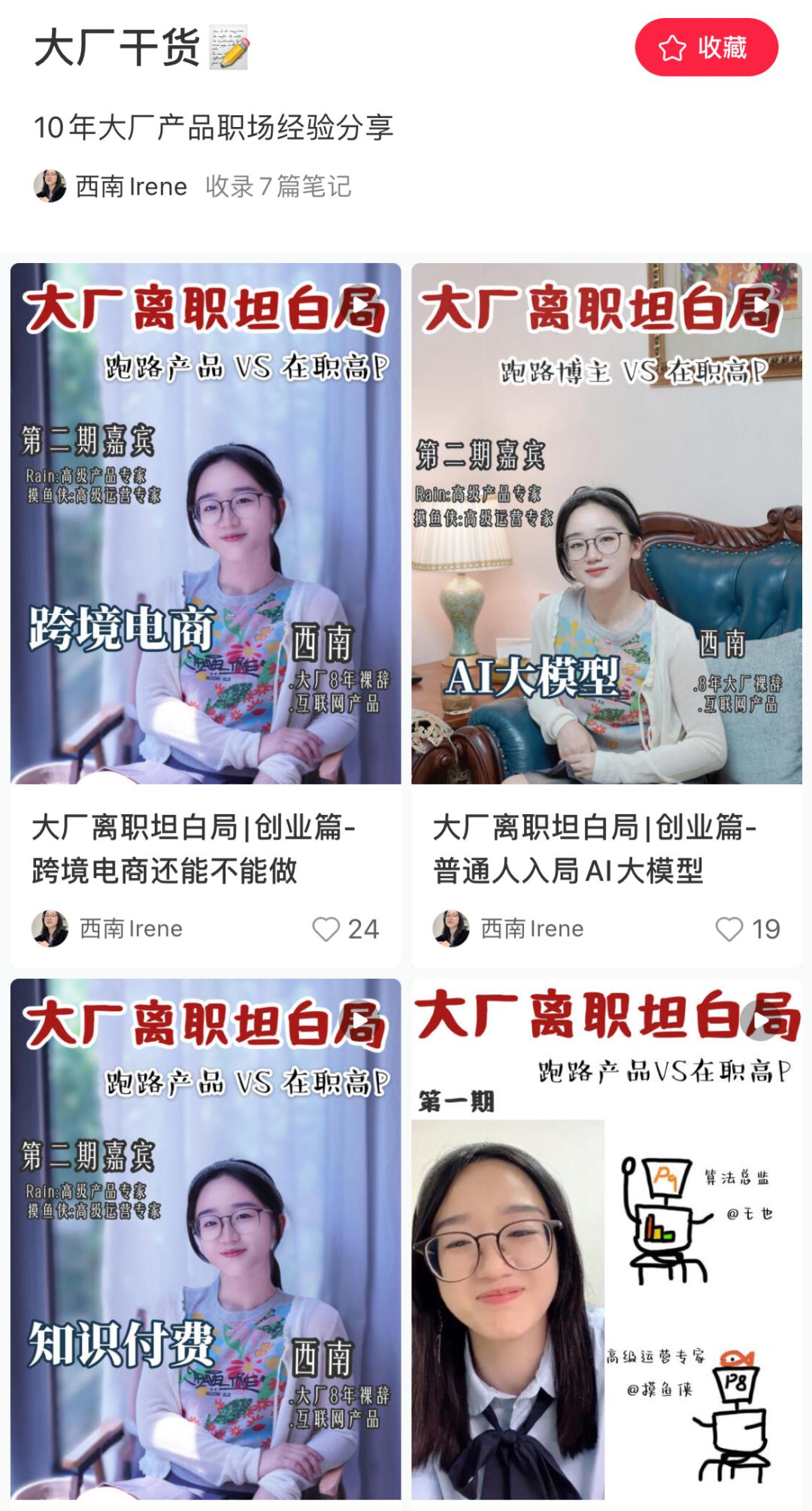 @西南Irene 离职一个月,账号除了分享离职后的生活以外,正在做一个叫“离职坦白局”的栏目,邀请大厂的前同事来直播间聊天,分享职场的干货。