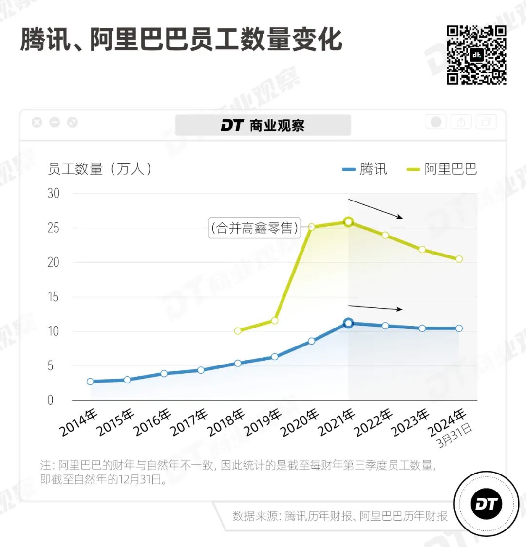即便是知名大厂,用人的成本也在紧缩。根据腾讯、阿里巴巴历年财报,腾讯、阿里巴巴都从2021年开始,员工数量逐年减少。
