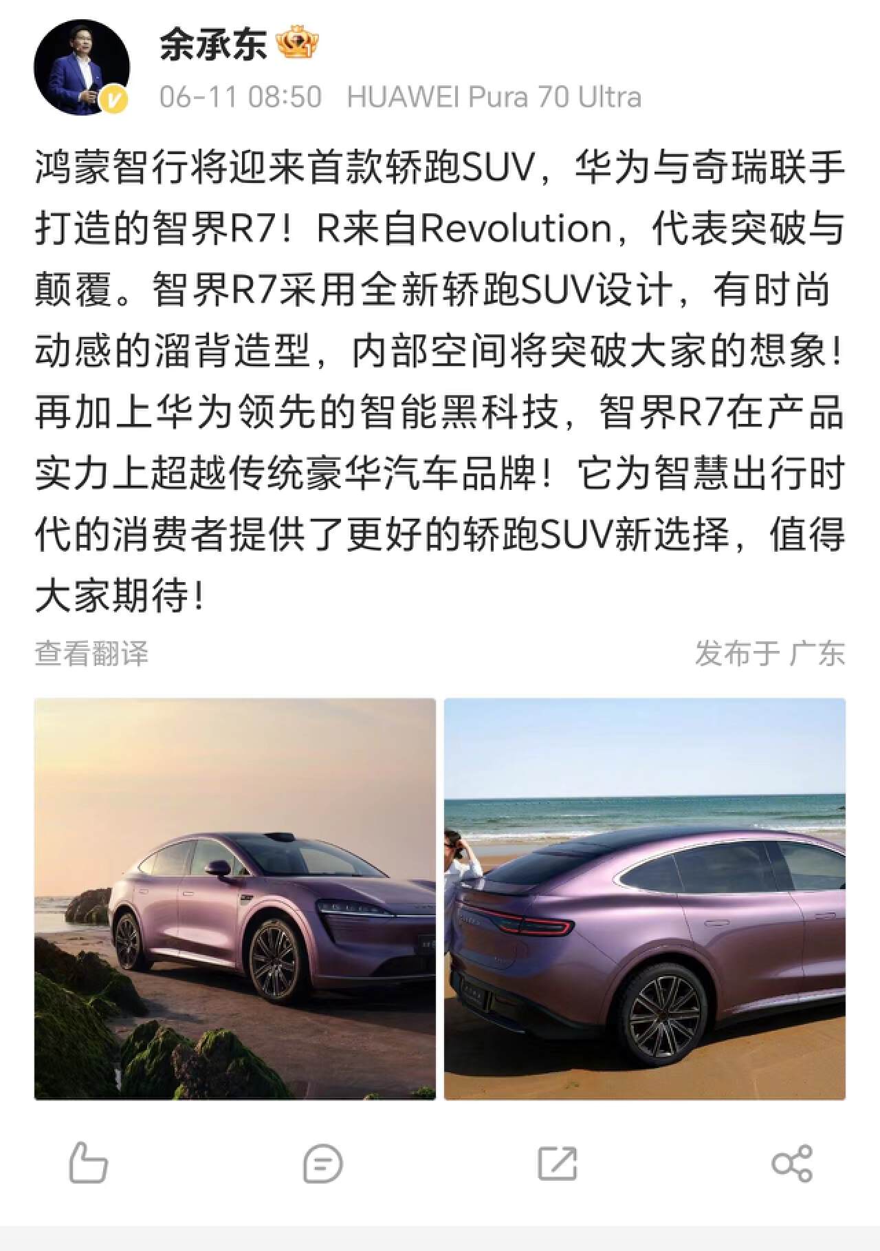 6月11日,智界第二款车型R7正式公布,采用溜背造型设计,定位鸿蒙智行首款轿跑SUV。