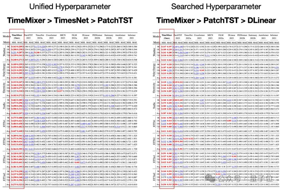 长程预测:为了确保模型比较的公平性,使用标准化参数进行实验,调整输入长度、批量大小和训练周期。此外,鉴于各种研究的结果通常源于超参数优化,该研究还包括了综合参数搜索的结果。