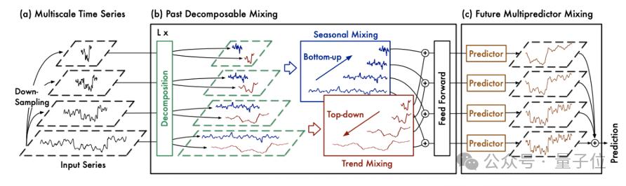 他们结合对时序趋势周期特性的分解以及多尺度混合的设计模式,不仅在长短程预测性能上大幅提升,而且基于纯MLP架构实现了接近于线性模型的极高效率。